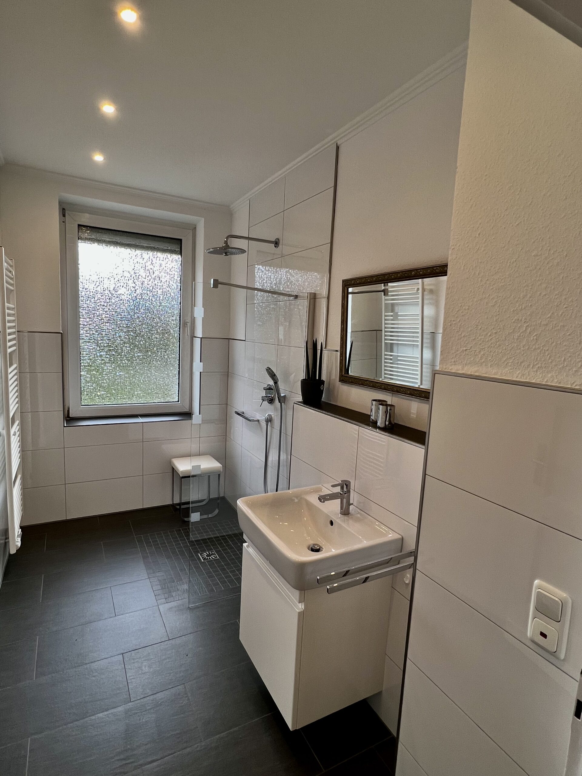 Im Badezimmer wurde eine barrierefreien Dusche eingebaut mit Duschanlage und Overhead-Shower. Die Toilette ist separat angeordnet.