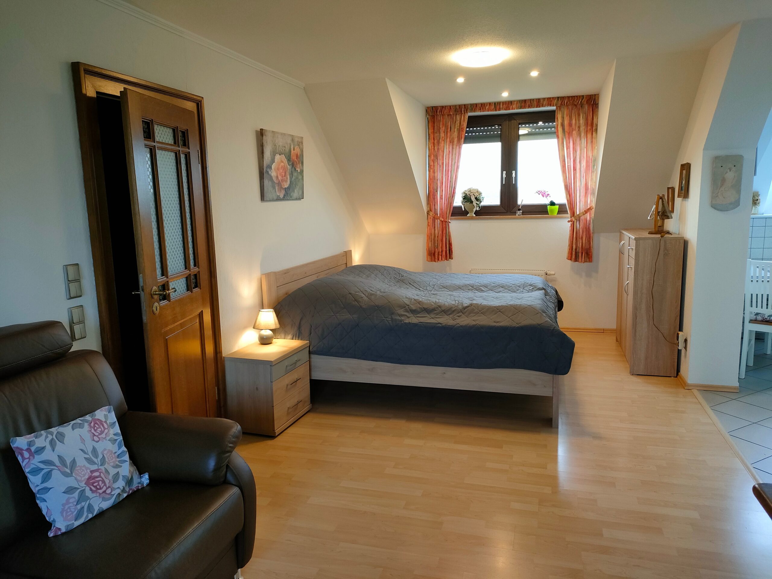 Ein-Raum-Appartment im Dachgeschoss 55 qm für max. 2 Personen, mit seperatem Zugang über eine Metall-Gitter-Außentreppe mit 16 Stufen