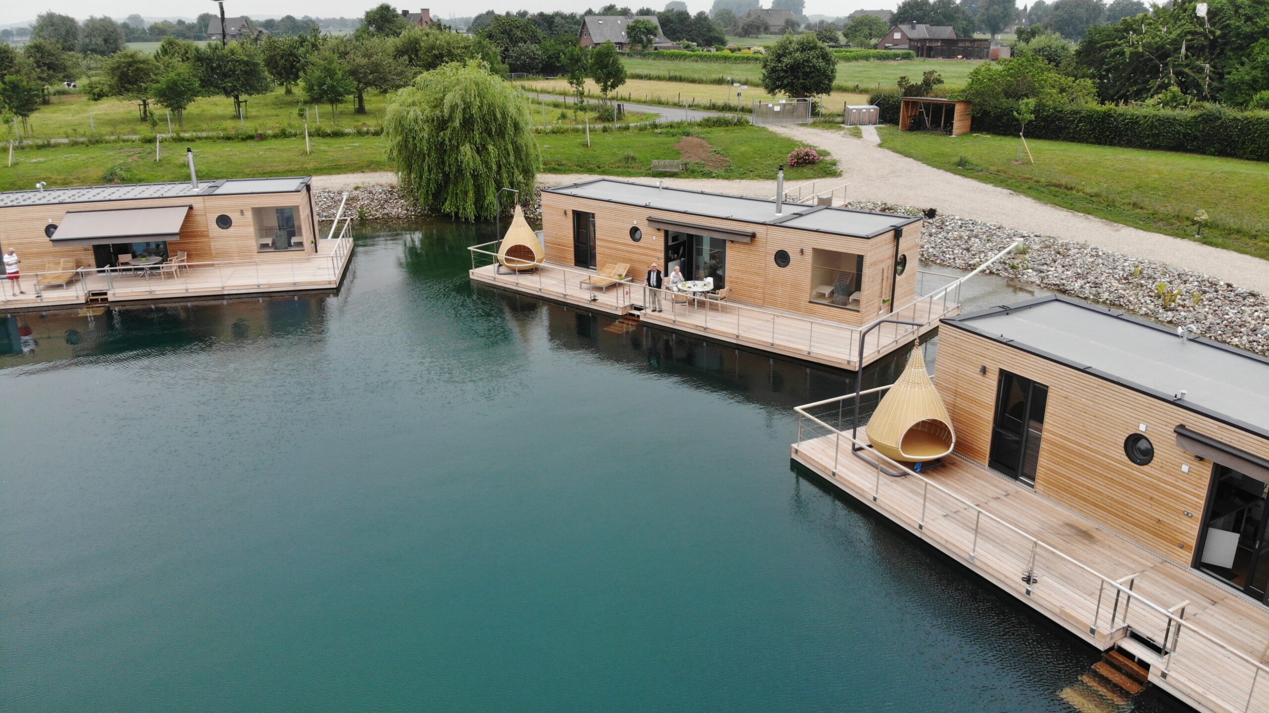 8 komfortable Hausboote mitten in derNatur. Fest am Ufer des DiersfordterWaldsees. 50 m2 / 2 Schlafz., bis zu 5Personen je Hausboot. Off ener Kamin, TV,WLAN, Spülmaschine. Große Terrasse (60m2), auf der Sie die vielen niederrheinischenTiere beobachten, grillen undentspannen können.