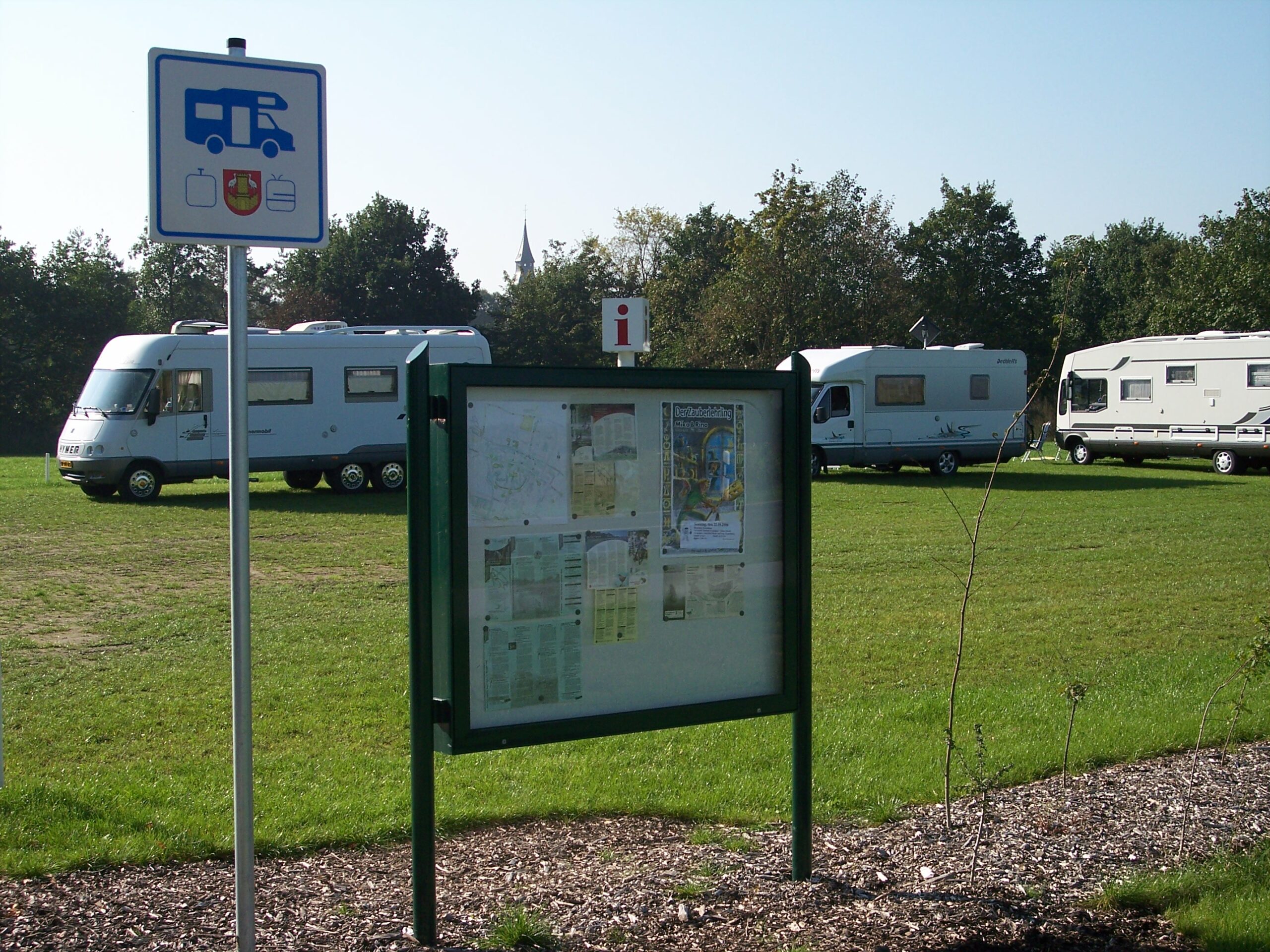 30 Stellplätze stehen auf Schotterrasen ganzjährig zur Verfügung. 2 x 6 Anschlussmöglichkeiten für Strom und 1 Wasserentnahmestelle werden dort gegen Münzeinwurf angeboten. Eine Abwasserentsorgung in wenigen hundert Metern Entfernung ist gegen Münzeinwurf auf dem Vorplatz des Feuerwehrgerätehauses ebenfalls möglich. Hier befindet sich auch eine Wasserentnahmestelle (für größere Wassermengen) gegen Münzeinwurf.