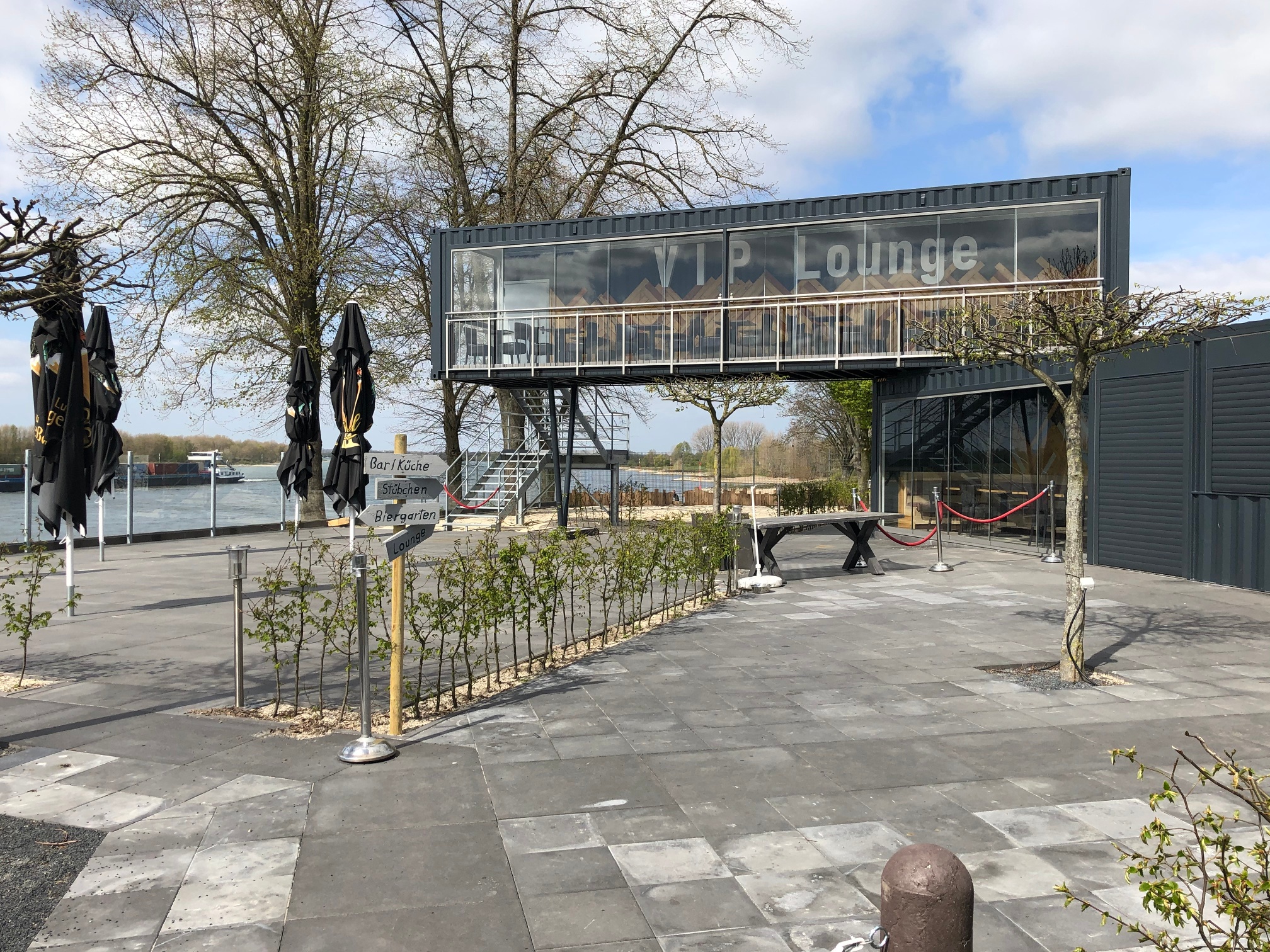 Auf der kleinen Speisekarte werden unter anderem verschiedene Salate, Fisch- und Fleischgerichte angeboten. Die Gäste können wählen, ob sie auf Bierzeltgarnituren, auf hochwertigen Möbeln im gepflasterten Bereich oder in Liegestühlen auf sandigem Untergrund den Tag und die herrliche Aussicht auf dem Rhein genießen wollen.