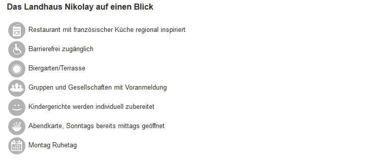 Betreten Sie das Landhaus Nikolay, dann betreten Sie eine eigene Sphäre. Das französisch anmutende Interieur ist sehr persönlich zusammengestellt und versetzt eintretende Gäste in südlichere Gefilde. Der Kamin strahlt im Winter eine heimelige Wärme ab. Eine große Auswahl Rohmilchkäse lässt Vorfreude aufkommen, auf das Ende eines aufwändigen Menüs. Und so lässt man sich – neugierig geworden – an einem der Tische nieder, und das kulinarische Abenteuer kann beginnen. Spätestens wenn der Küchenchef seine Gäste persönlich begrüßt und die Gerichte des Tages empfiehlt. Die Speisekarte soll hier nicht viel mehr sein als eine grobe Orientierung. In der Gourmetküche im Landhaus Nikolay wird der Genuss täglich neu erfunden und hinein kommt das, was gerade im Garten hinter dem Haus geerntet werden will, was an Pilzen im Wald sprießt oder dem Koch auf dem Pariser Großmarkt ins Auge gesprungen ist.