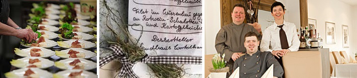 Die besondere Spezialität der Schneiders sind gelungene Feste und andere Großveranstaltungen. „Wir bieten das Rundum-Sorglos-Paket für Hochzeitsgesellschaften oder Geburtstage“, so Pit Schneider. Festliche Gesellschaften bekommen hier einen vollendeten Rahmen: mit feiner Küche, professionellem Service und einem Hauch Landromantik. Und vor allem mit ganz viel persönlichem Engagement der Gastgeber: „Es wird nie vorkommen, dass es eine große Feier gibt, und wir sind nicht dabei“, beschreiben die Schneiders. Immer feiert mindestens einer der Chefs mit und sorgt dafür, dass auch das Tüpfelchen auf dem i stimmt.