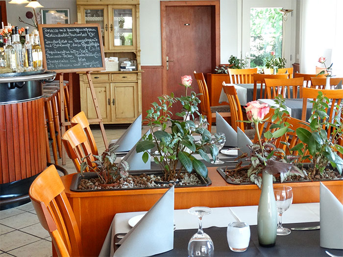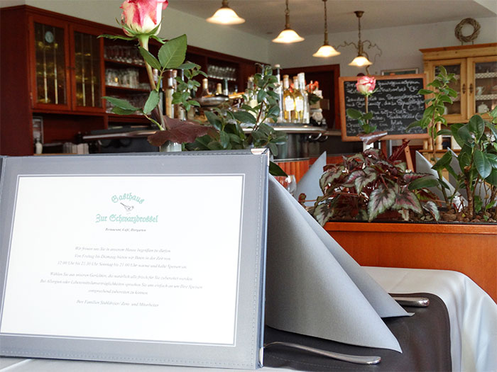 „Für jeden ist bei uns auf der Karte etwas dabei“, da ist sich Sandra Zens sicher. „Und auch für jeden Geldbeutel.“ Mittags bietet sich ein Drei-Gang-Menü an, am Nachmittag gibt es selbstgemachten Kuchen; und eine kleine Nachmittagskarte versorgt die Gäste, bevor am Abend wieder die ganze Bandbreite der kreativen und zugleich heimatverbundenen Küche zur Auswahl steht. In der Schwarzdrossel werden Sie durchgehend bis in den Abend hinein mit Köstlichkeiten verwöhnt. Wenn sich kleine Festgesellschaften angekündigt haben, geht das À-la-carte-Geschäft trotzdem weiter. Die Stammgäste verlassen sich hier ja auf die „Drossel“. Und das teilweise schon seit Jahrzehnten.