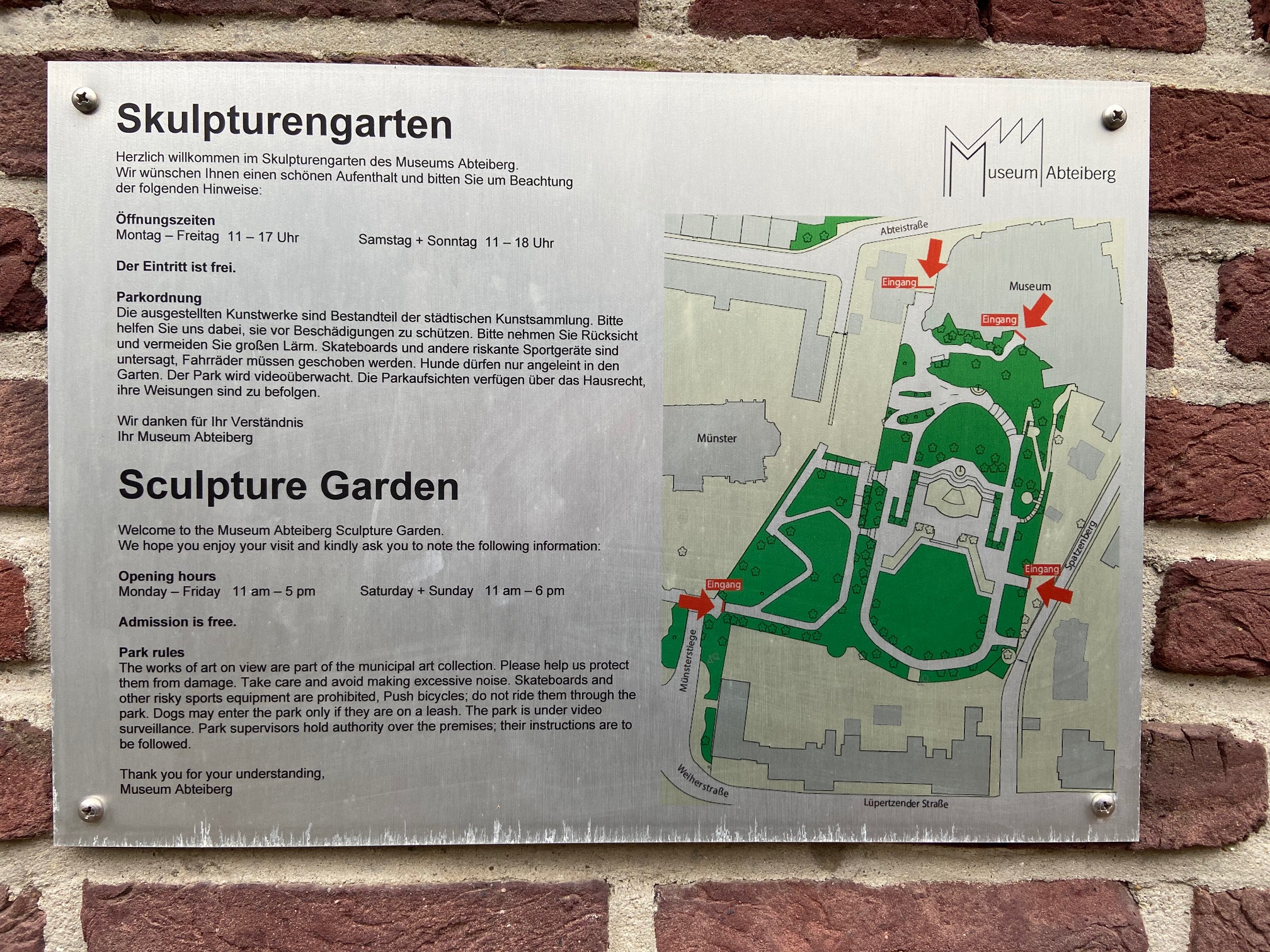 Im ehemaligen Obstgarten der Mönche wurde2 002 aus Anlass der dezentralen Landesgartenschau EUROGA 2002 plus, im Rahmen der Kunstwege, der Skulpturengarten Abteiberg eröffnet. Damit erhielt das Museum Abteiberg endlich die immer geplante, jedoch nie verwirklichte Außendimension, die sich als Einbettung des Museums in die urbane Lage des Abteibergs unmittelbar am Alten Markt von Mönchengladbach definiert.