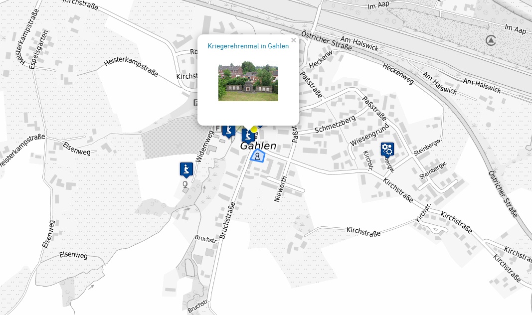 Historische OrteSeit 1922 stehen die 52 Namen unter dem Schriftzug „Es starben für das Vaterland“. 1953 wurde das Ehrenmal erweitert. Auf vier Steinplatten stehen 183 weitere Namen und gemahnen an die Toten im Zweiten Weltkrieg. Zweimal jährlich – beim Schützenfest und am Volkstrauertag – versammelt sich die Gahlener Bevölkerung, um der Opfer zweier Weltkriege zu gedenken.