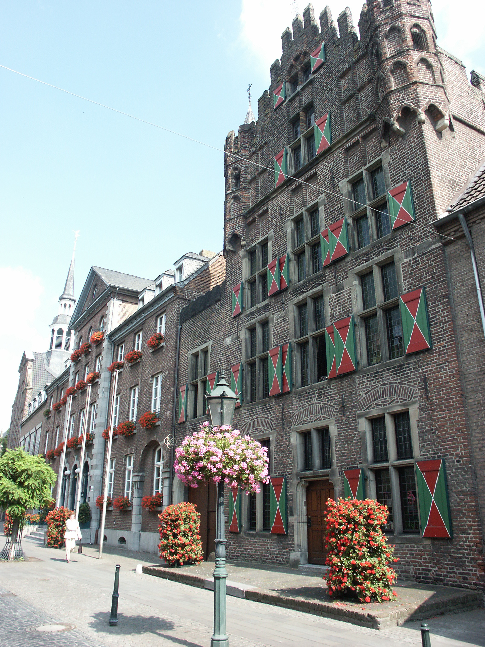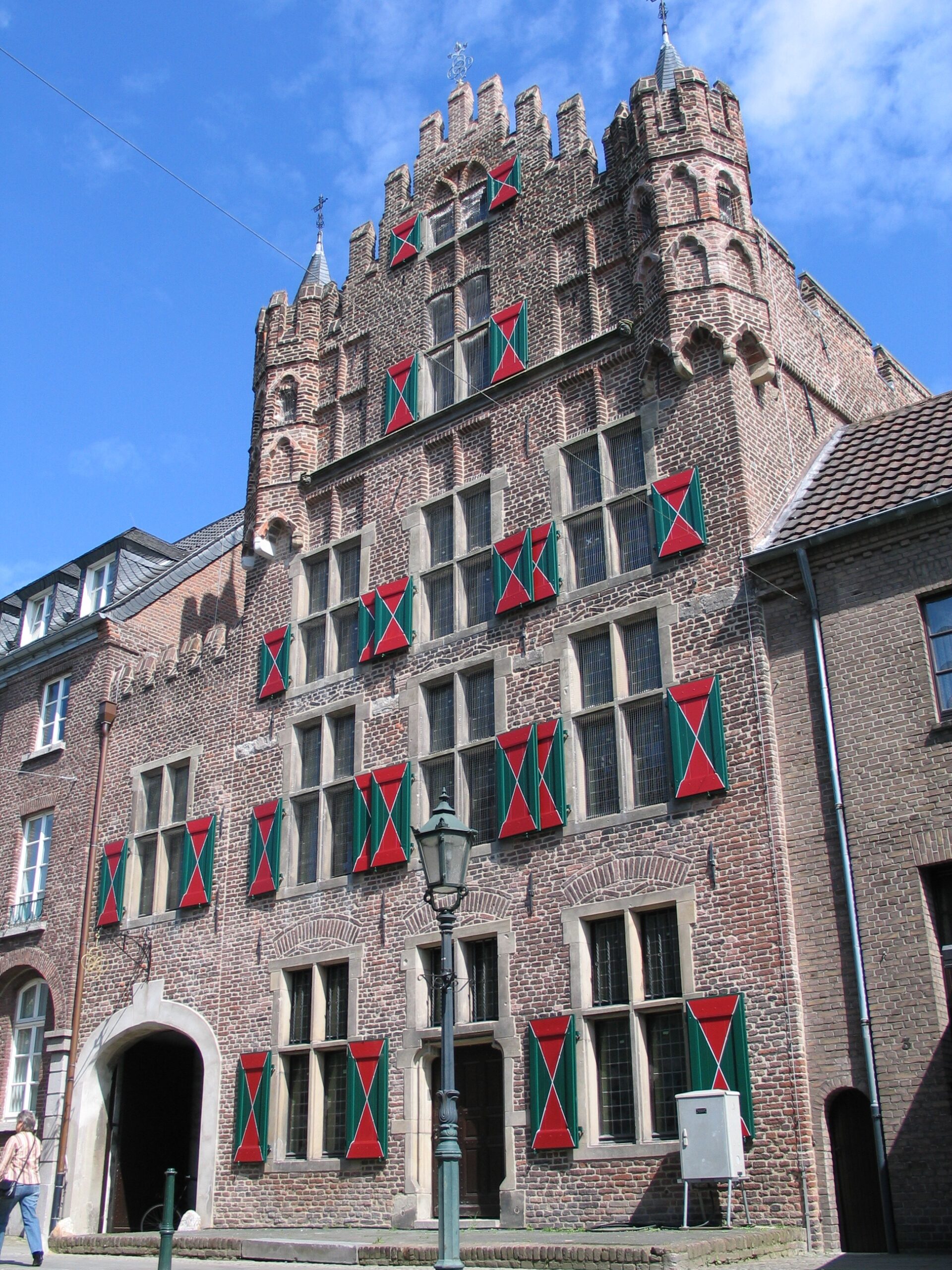 Historische OrteEinblicke in sein Inneres und in seine mehr als 500-jährige Geschichte gibt das Haus zu den Fünf Ringen in Goch. Es wurde um 1550 als stolzes Patrizierhaus gebaut und liegt in unmittelbarer Nähe des Gocher Marktplatzes, wo es stadtprägender Blickfang ist. Schließlich ist es das einzige noch fast vollständig erhaltene Haus aus dem 16. Jahrhundert. Obwohl es im Zweiten Weltkrieg im inneren Kern völlig zerstört wurde, sind die Außenmauern stehen geblieben. Bis zum heutigen Tag ist das Haus Teil des gepflegten historischen Stadtbildes von Goch geblieben. Beim Haus zu den Fünf Ringen handelt es sich um einen dreistöckigen, drei Achsen breiten Backsteinbau mit zweigeschossigem zinnbesetztem Giebel zwischen achtseitigen Eckwarten. Die Fensterkreuze und Kragsteine der Eckwarten bestehen aus Haustein. Über den Kreuzstockfenstern im dritten Stock befinden sich hochrechteckige Blenden. Darüber wurde das Horizontalgesims erneuert. Das untere Fenster in der Mittelachse des Giebels wird von zwei Kreuzstockblenden flankiert, das kleinere obere Fenster schließt mit einer Spitzbogenblende. Die westlich einfachere Rückseite des Hauses besitzt einen Stufengiebel. Im dritten Geschoss sind drei mittelalterliche Kreuzstockfenster mitoriginaler Substanz erhalten. Im Giebel spendet je ein Paar Rechteckfenster übereinander Licht. Kreuzstockfenster und Kreuzstockblenden wurden unter anderem in den Jahren 1900 / 01 nach Entwürfen des Diözesanbaumeisters Renard aus Köln wiederhergestellt. Gleichzeitig erhielten die Fenster der vorderen Fassade eine Zementumrahmung und die bunten Holzblenden.