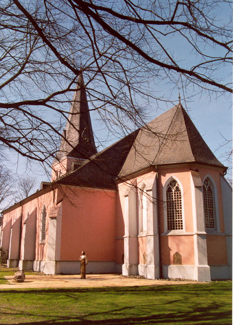 Die Anfänge gehen bis auf das Jahr 1230 zurück, als nachweislich bereits ein Pfarrer im Dorf ansässig war – der ursprünglich einschiffige Sakralbau wurde als „neue Kirche“ des Kirchspiels Repelen erbaut und gab dem Ortsteil seinen Namen – ursprünglich dem heiligen Quirinus geweiht – 1580 evangelisch reformiert, später um die Seitenschiffe erweitert und bis heute Sakralraum der evangelischen Gemeinde