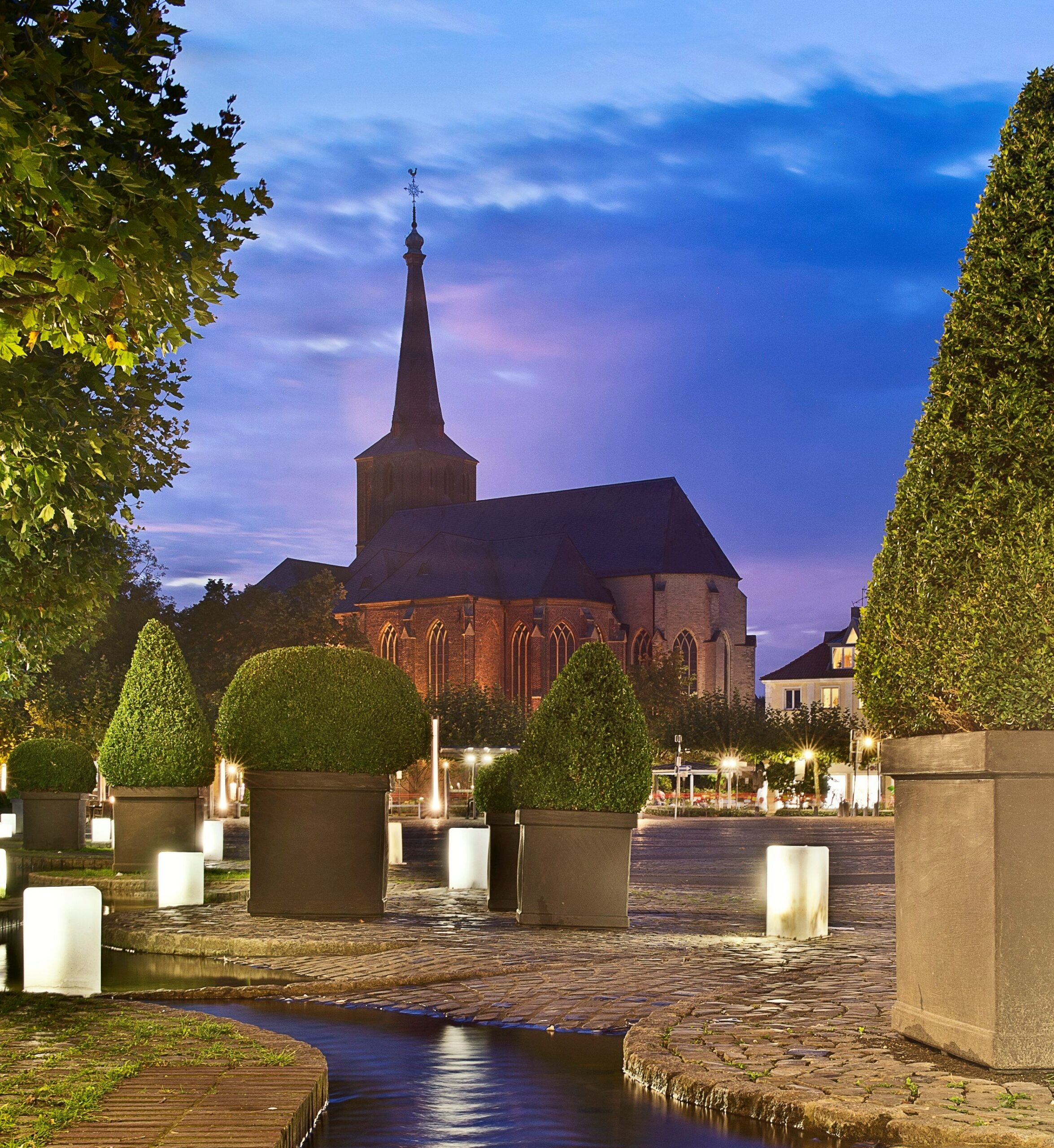 Kirchen & KlösterDie dreischiffige, gotische Hallenkirche wurde in der ersten Hälfte des 14. Jahrhunderts erbaut und im laufe der Zeit mehrmals zerstört. Nach der Kriegszerstörng 1945 wurde sie vereinfacht und ohne Gewölbe durch Dominikus Böhm wieder aufgebaut. Hier befinden sich die Reliquien von Galenus und Valenus, den Gelderner Stadtpatronen. Sehenswert ist der Eselsbogen mit Inschrift.