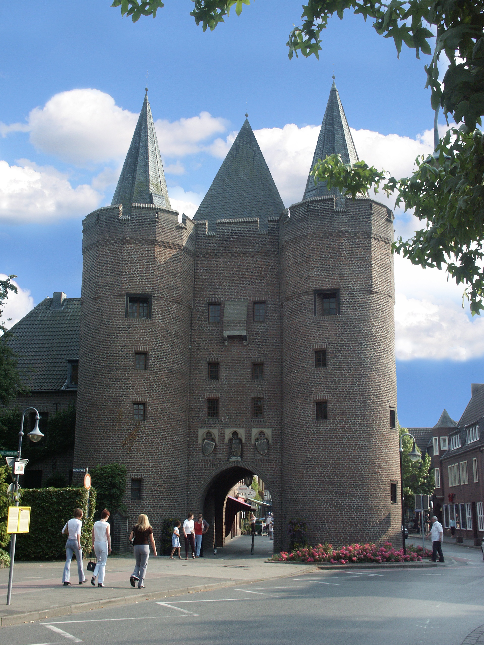Historische OrteIm Jahre 1458 erstmalig erwähnt, aber wohl noch zur Befestigung des 14. Jahrhunderts gehörig. 1919 Wiederherstellung nach teilweisem Einsturz. Im zweiten Weltkrieg die Dächer des Mittelbaus und des westlichen Turms zerstört. Torgewände beschädigt, im Mauerwerk Treffer und Risse. Umfassende Wiederherstellung und als Heimatmuseum genutzt. Backstein. Der längsrechteckige Mittelteil umfasst über spitzbogiger tonnengewölbter Durchfahrt drei Geschosse, an der Feldseite flankiert von zwei Rundtürmen, deren Obergeschoss über Pendentifs ins Zehneck übergeführt. Spitze Schieferdächer. Der umlaufende Zinnenkranz erneuert. An der Standseite des Mittelbaues sechseckige Eckwarten. Über der feldwärts gelegenen Toröffnung drei nasenbesetzte Spitzbogenblenden aus Haustein. Darin erneuert die Sandsteinfigur des heiligen Georg zwischen dem Gocher und dem preußischen Wappen. In den einzelnen Geschossen kleine rechteckige Fenster. Zwischen den beiden oberen Gusserker aus Haustein. Zur Stadt hin zwei größere Fenster. Im östlichen Turm die Treppe.