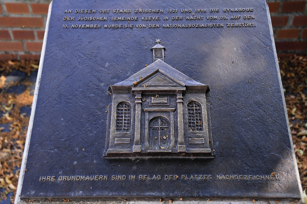 Historische OrteDie Synagoge Kleves war im Stil des niederländischen Klassizismus gebaut und kostbar ausgestattet. Sie wurde 1938 niedergebrannt. An ihrem Platz entstand ein Denkmal, der Synagogenplatz. Hier ist durch eine Ziegelmarkierung der Grundriss der ehemaligen Synagoge abgebildet.